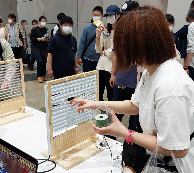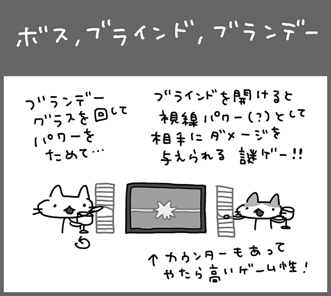ブラインドを指でめくり、視線で相手の体力を削る2人対戦格闘ゲーム。