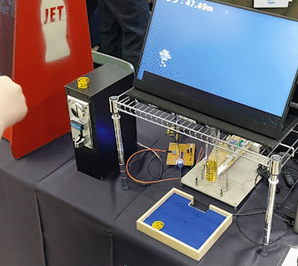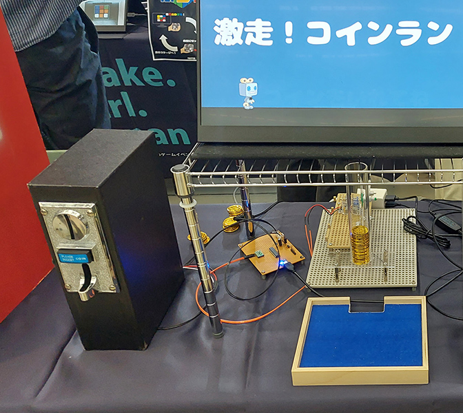 おもちゃのコインを投入することでキャラクターをジャンプさせるランゲームです。操作方法はコインを入れるだけなので、誰でも遊べます!